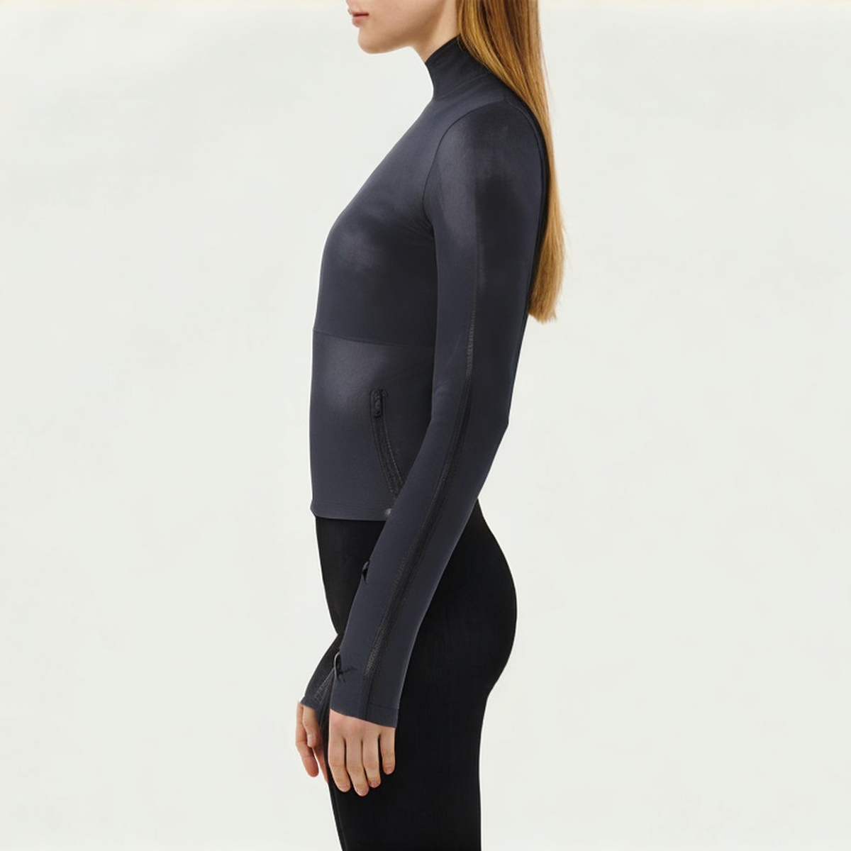 Make a statement with this women’s tight-fitting long-sleeved T-shirt, highlighted by a stylish tie-dye design. The stand-up collar and slim fit highlight your curves, while thumb holes provide comfort and extra wrist protection. Zippered pockets on the sides are handy for carrying small items, and the zipper closure adds a sporty and practical feel to the garment.