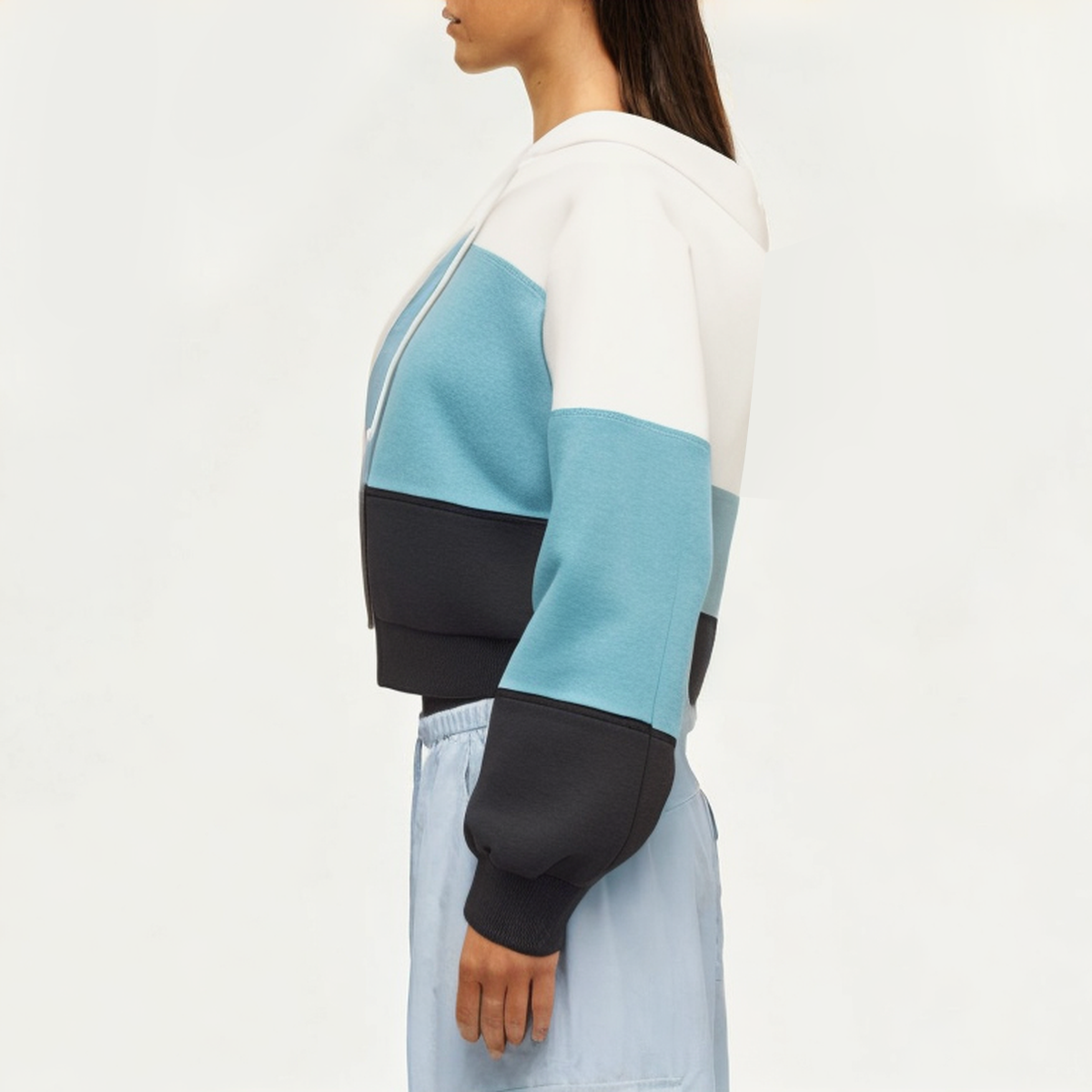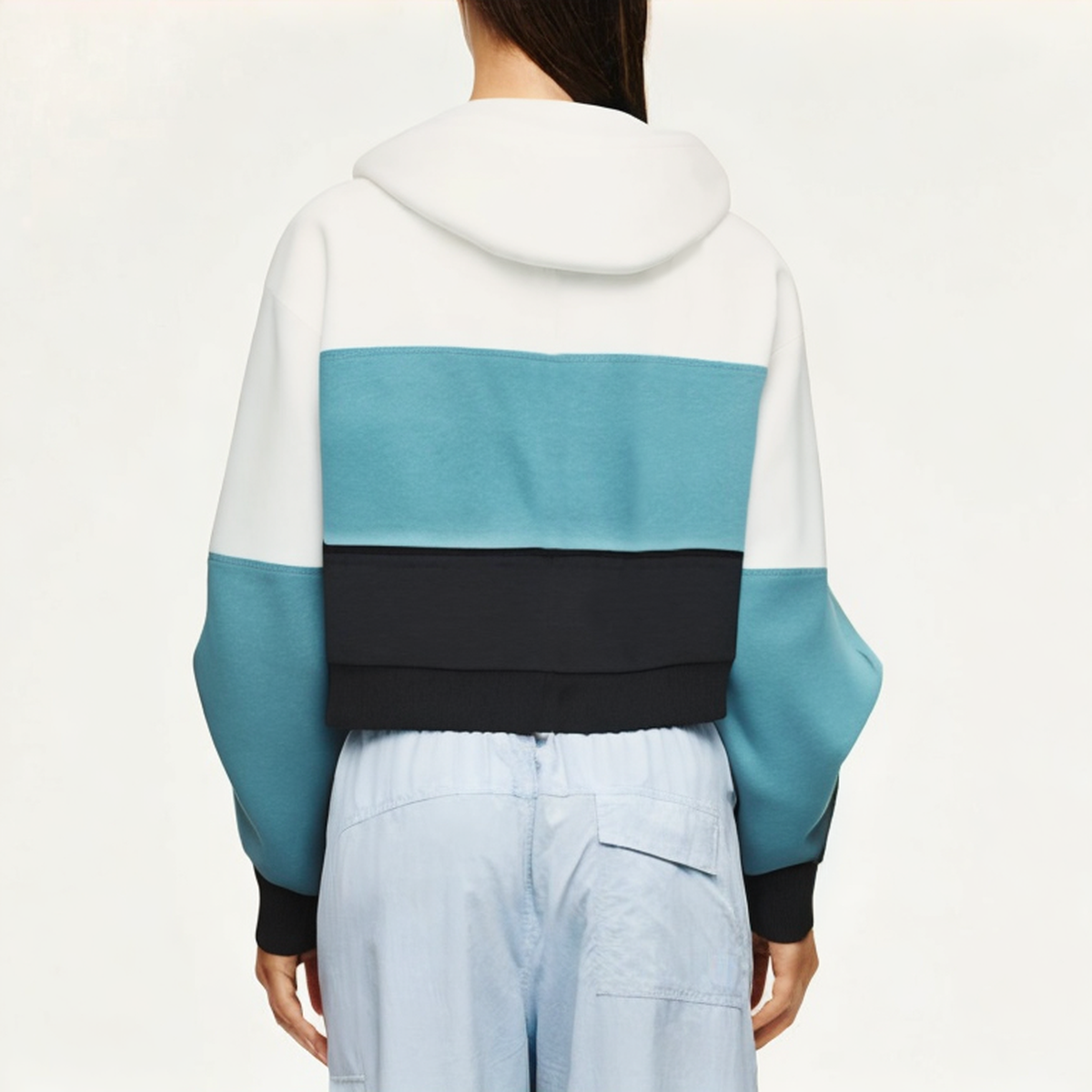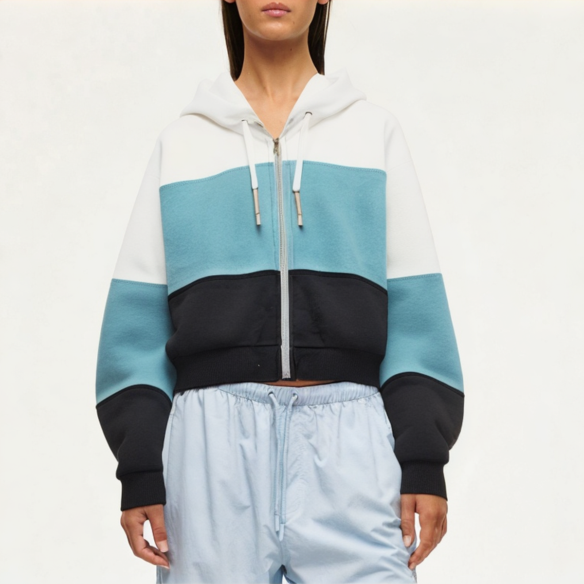 This women’s sweatshirt jacket adds a pop of colour to your activewear with its stylish colour-block design. The hood adds practicality and keeps out the cold. The jacket has elastic cuffs for a snug fit and greater freedom of movement. The zipper closure makes it easy to put on and take off, making it suitable for a variety of occasions.