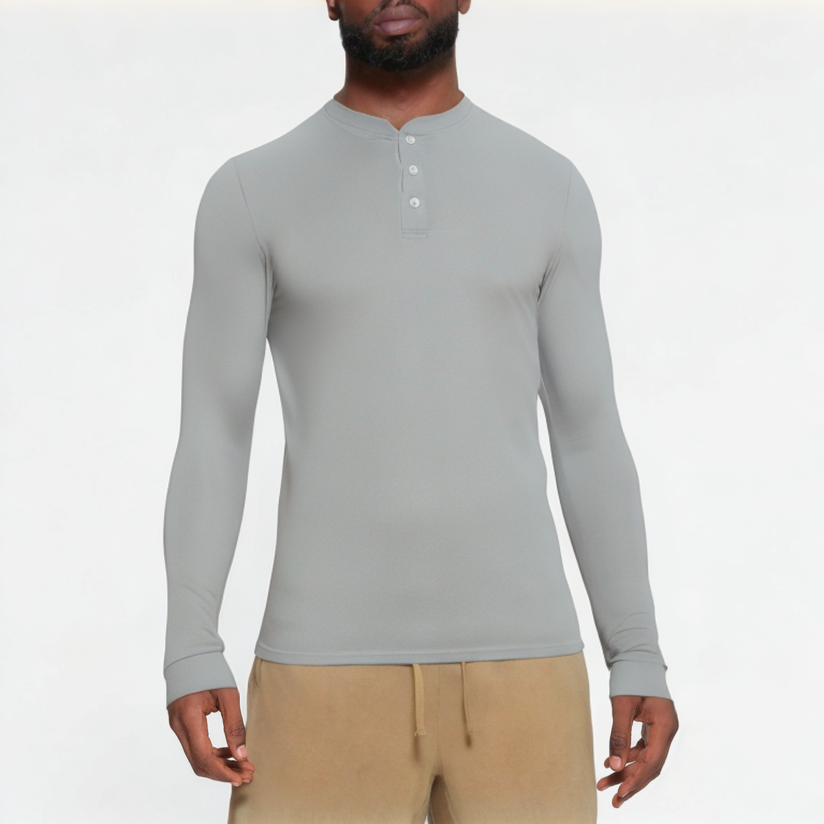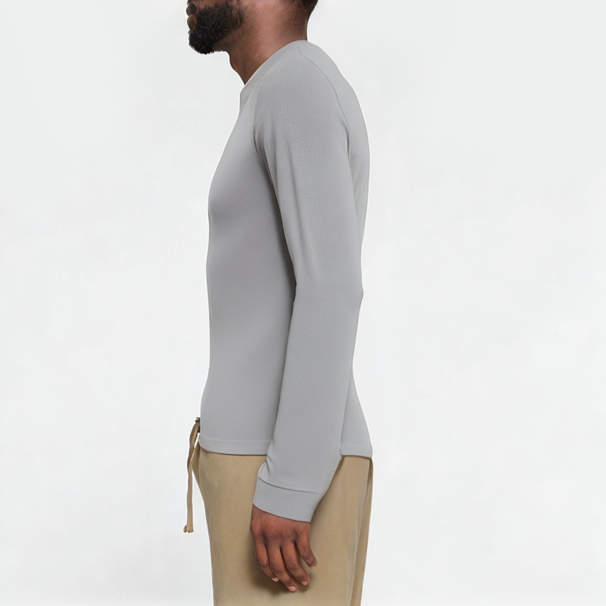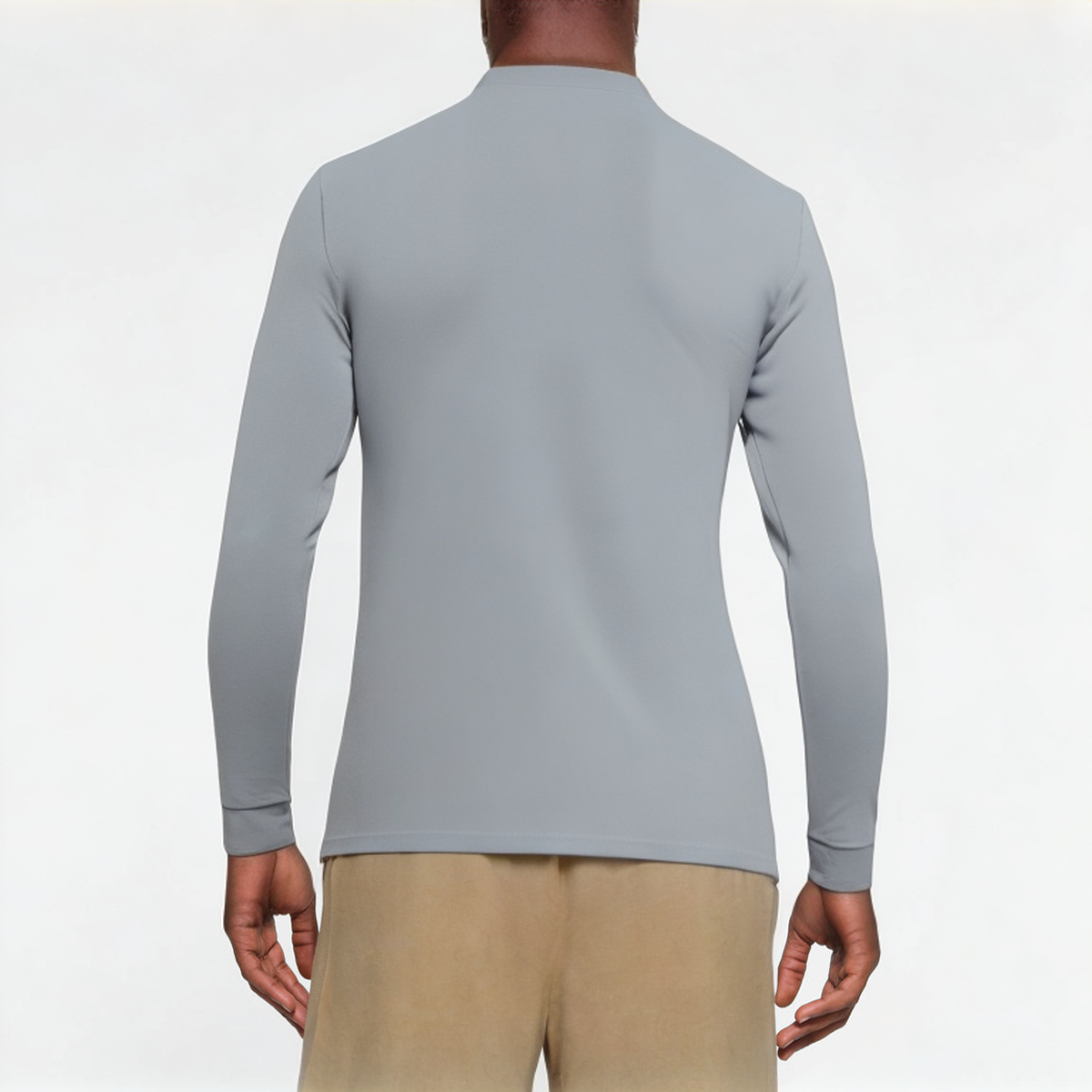 This men’s sports long-sleeved shirt features a solid color design, simple and elegant, suitable for a variety of occasions. The round neck and 3-button placket design add a sense of fashion, and the elastic cuffs ensure a comfortable fit. Its breathable and quick-drying fabric is perfect for sports and daily activities, keeping you dry and comfortable at all times.
