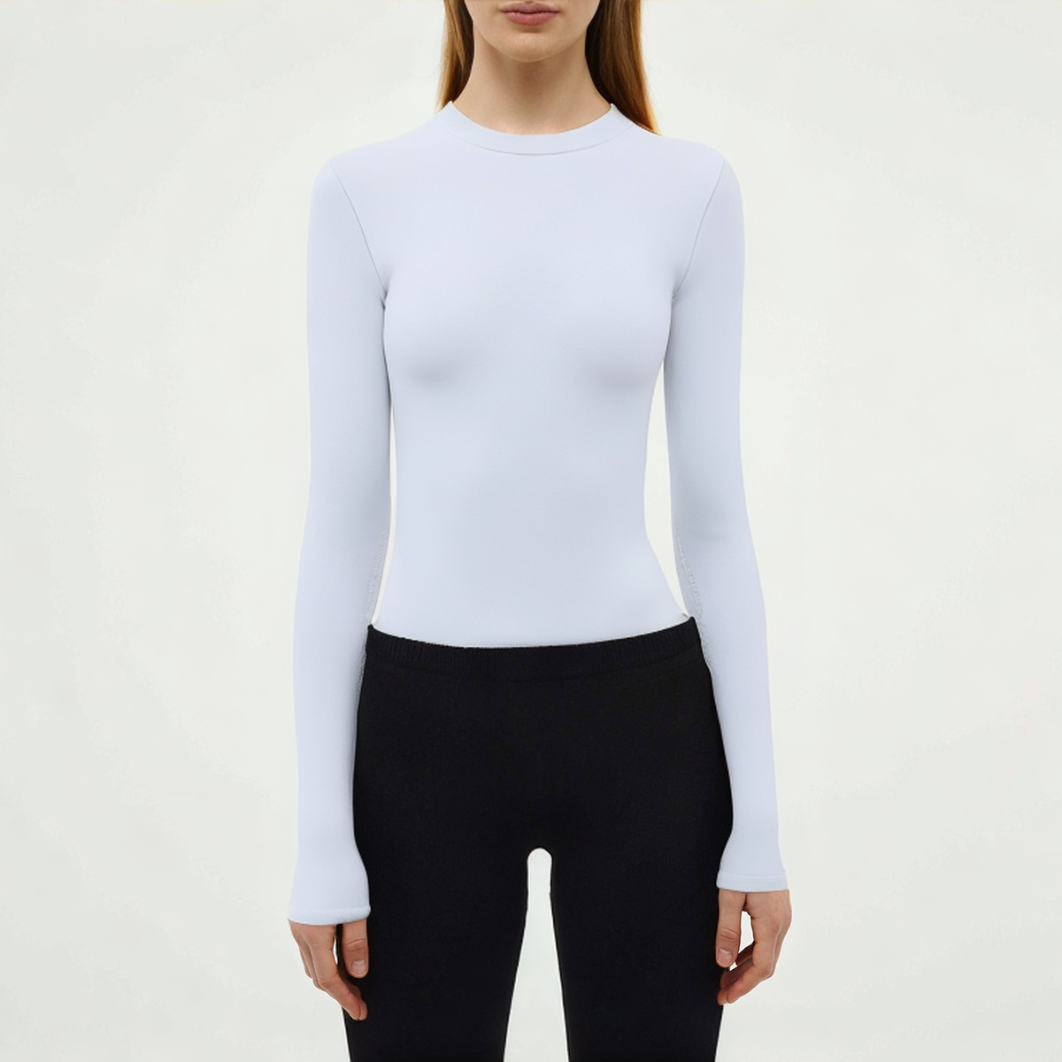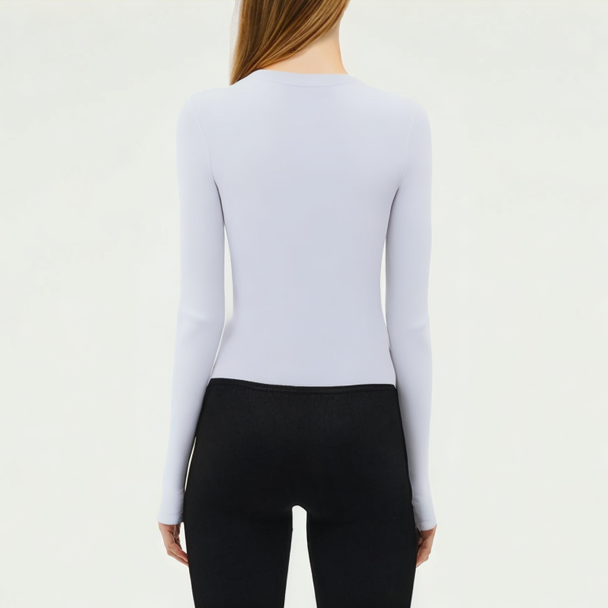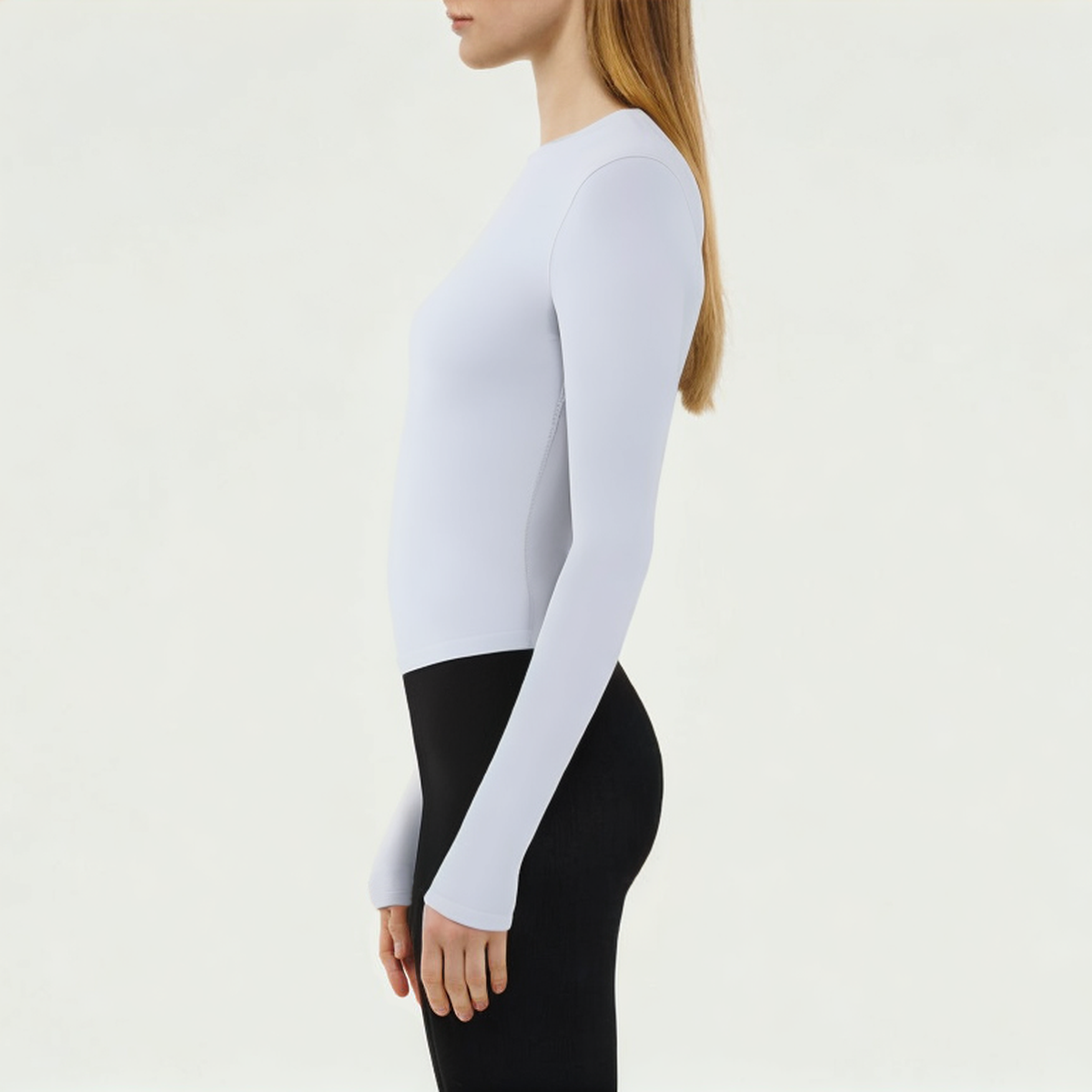 This women’s tight long-sleeved t-shirt features a crew neck design, showing simple and fashionable style. The seamless construction ensures ultimate comfort and reduces friction, making it ideal for sports and daily wear. The knitted ribbed details add a layered look to the overall design while enhancing the fit and showing off an elegant figure.