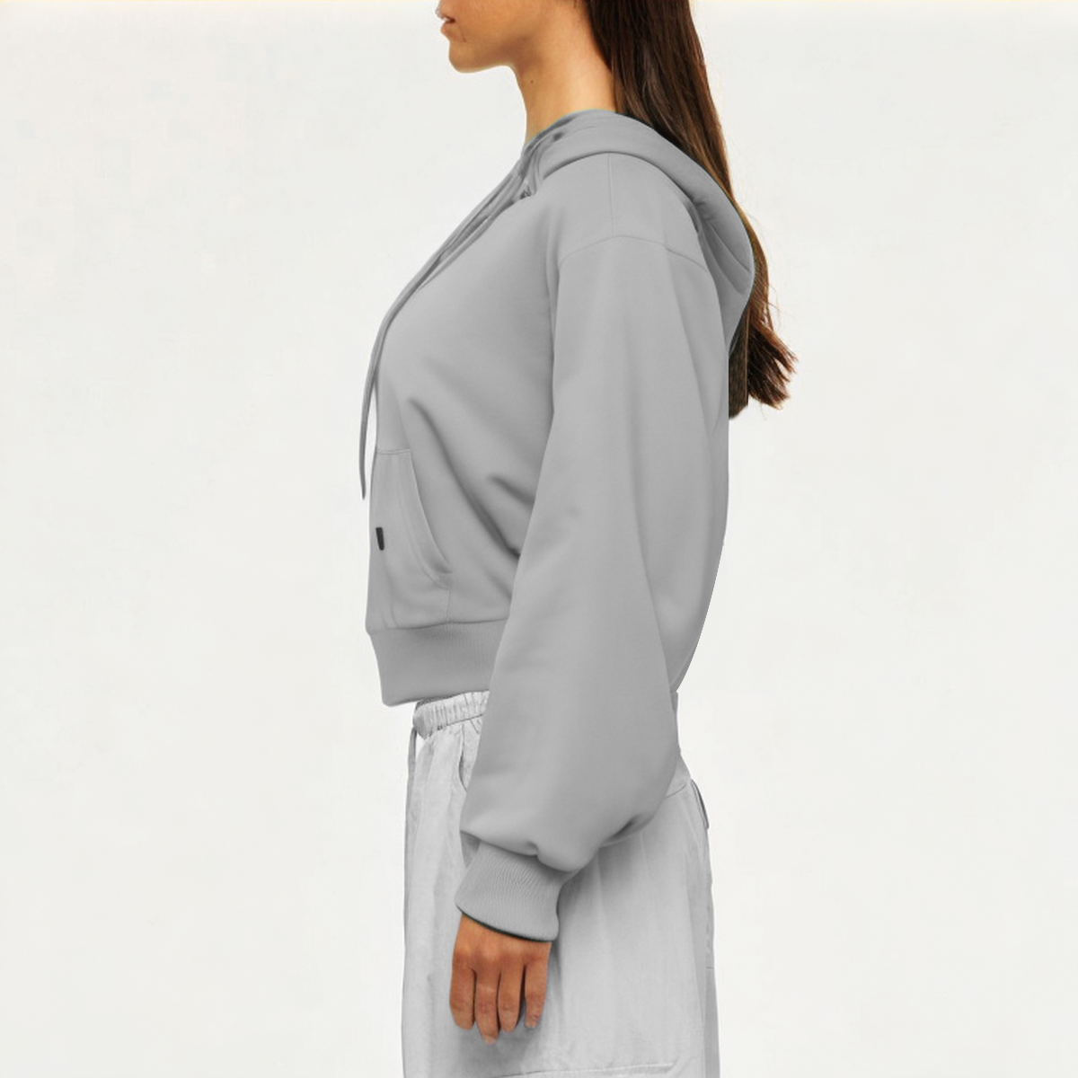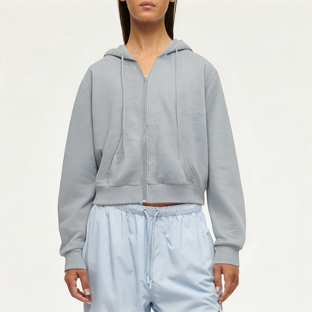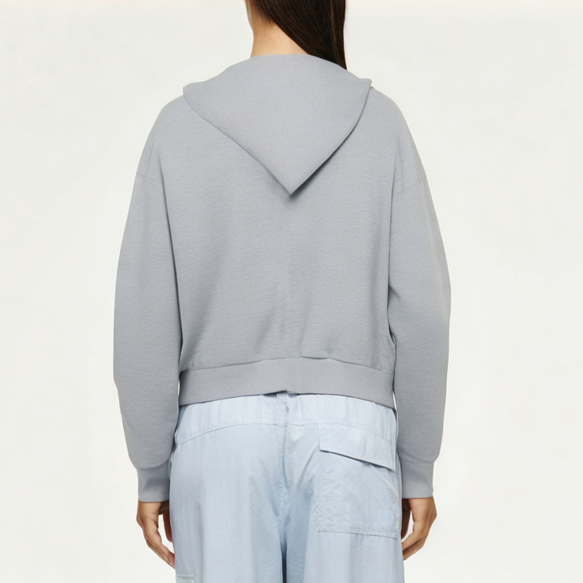 This women’s sweatshirt jacket is a classic and stylish piece with its simple solid color design. The hood provides extra protection from the wind while also adding a dynamic touch to the look. The jacket’s elastic cuffs and ribbed hem ensure a comfortable fit for a variety of activities and sports.